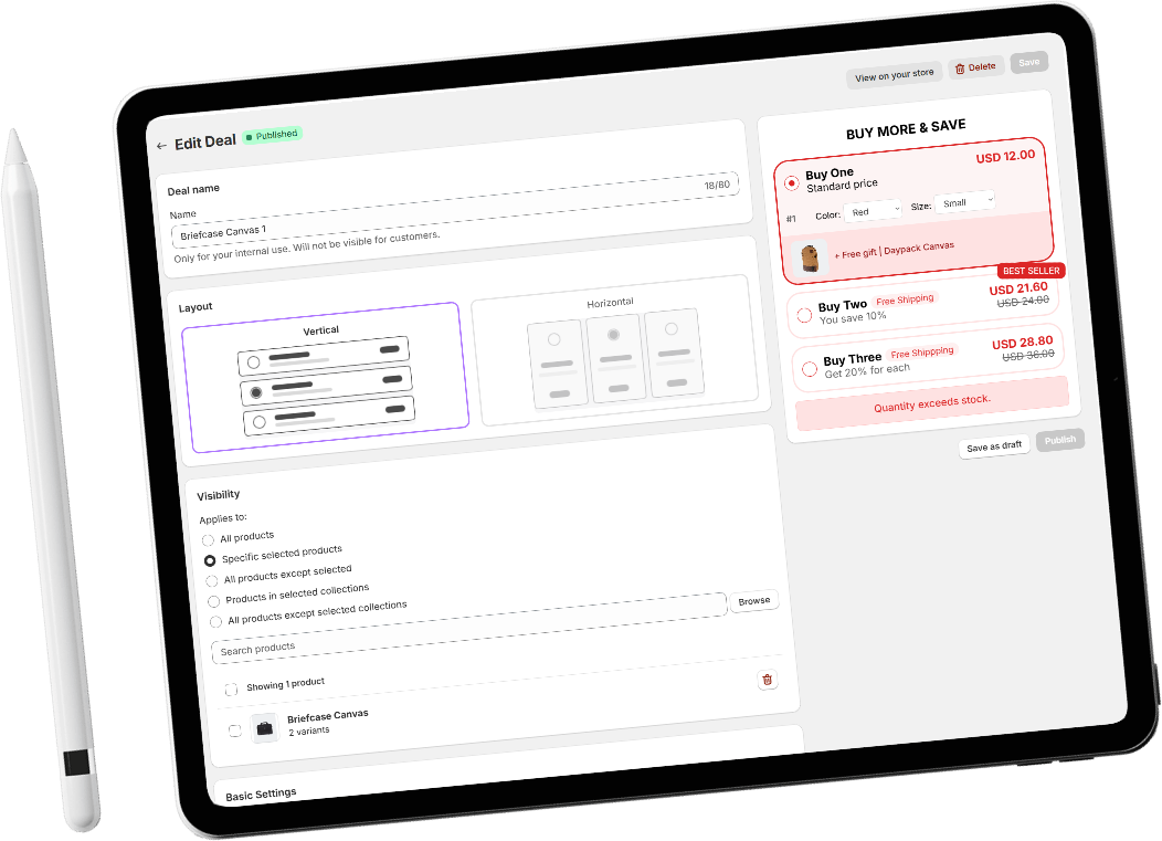 * Create any offer, from custom bundles to BOGO, without writing a single line of code.